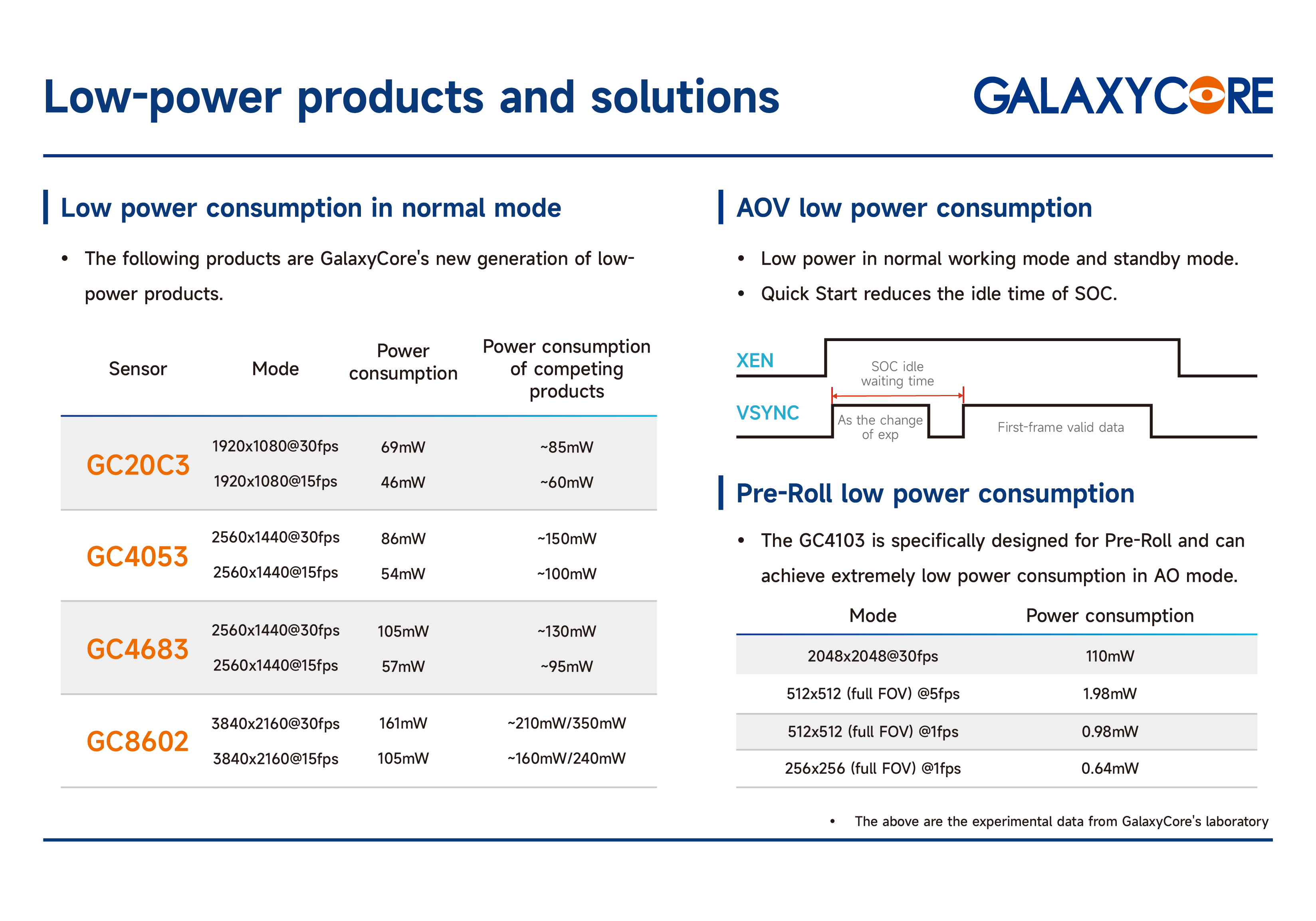 The GC4053 incorporates upgraded low-power technology and a hardware-based AOV control unit, enabling fast startup, low-power standby, and efficient normal-operation modes. Actual measurements show that when outputting at full resolution and 30 fps, power consumption is only 86 mW — approximately 35–40% lower than comparable products — delivering industry-leading energy efficiency.